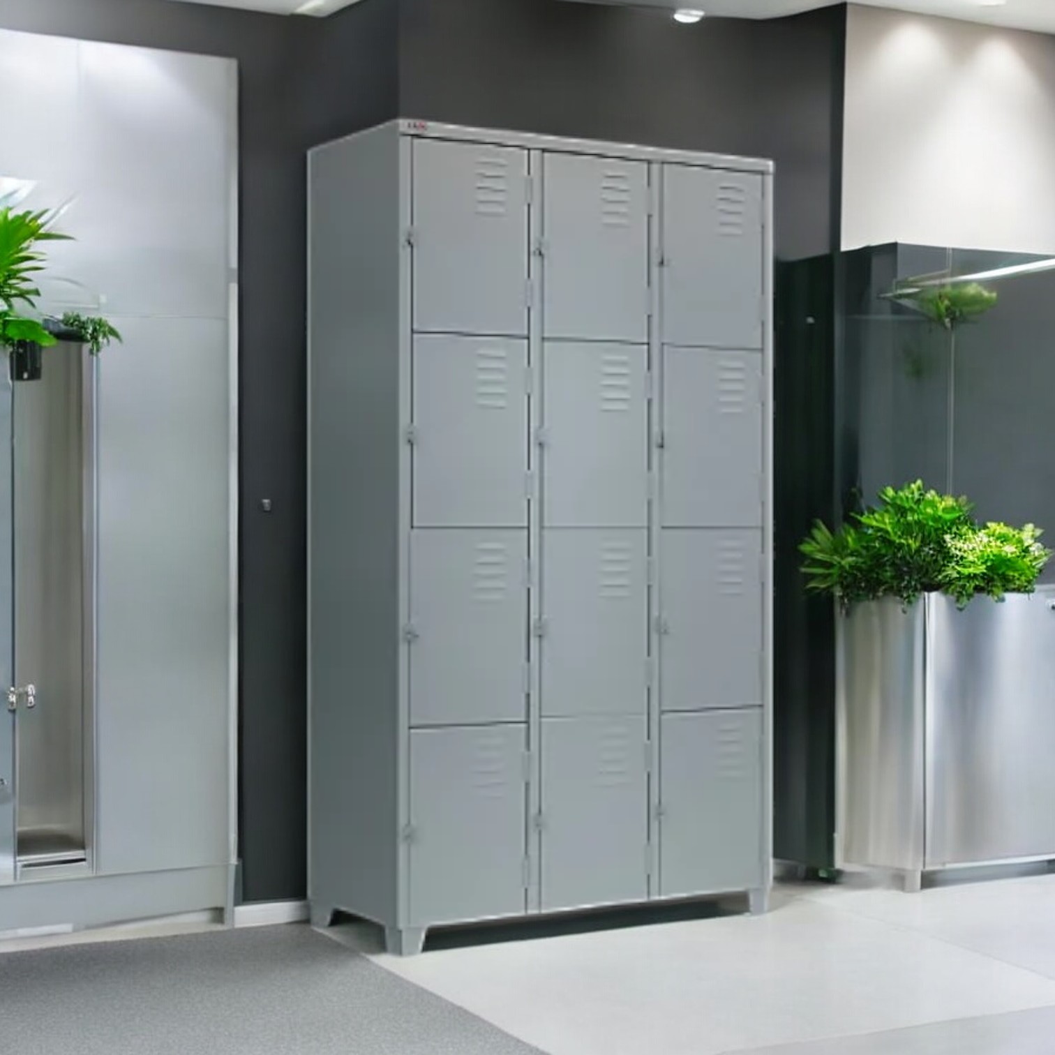 Armário multiuso de aço guarda volumes 12 portas pequenas, fabricado em aço chapa 26 com dobradiças metálicas e portas com ventilação antimofo, alguns modelos fornecem porta etiqueta estampado na porta. O roupeiro de aço para vestiário 12 portas pequenas da marca Shopping do Aço é fabricado nas medidas 198x92.5x40, comporta até 80% dos modelos de capacetes fabricados, além de ser ideal para proteção e segurança de objetos e pertences de volume pequeno a médio como bolsas, roupas, casacos, mochilas e sapatos. O roupeiro para vestiário de aço é indicado para atender as necessidades de armazenamento de pertences pessoais de funcionário em fábricas, de visitantes em hospitais e ainda para alunos e funcionários de academias.